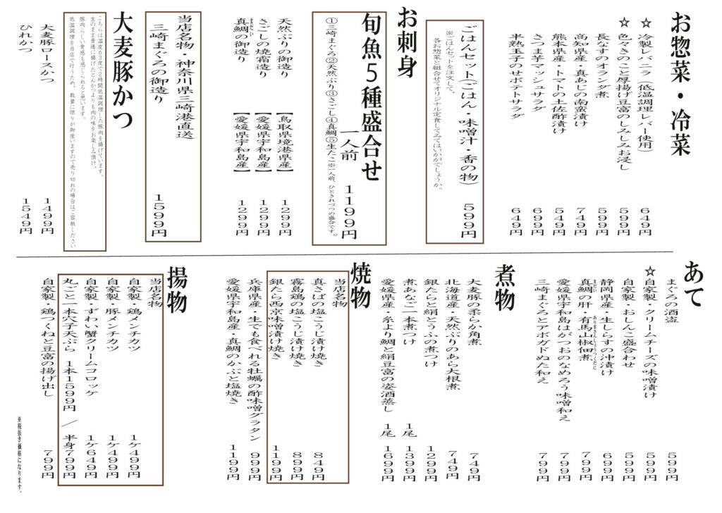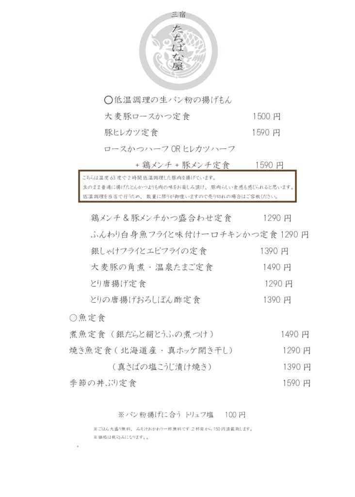 | 営業時間 | [昼] 11:30〜14:00(Lo13:30) 生パン粉フライの揚げもん定食(低温調理のとんかつ、アジフライ、自家製豚鶏メンチ)、焼き魚定食、煮魚定食、刺身定食 [夜] 18:00〜23:00(Lo お料理22:00 お飲み物22:30) 普段使いの和食の店 焼き魚と美味しいあなご天ぷら、海鮮丼ぶり [お持ち帰りTakeOut] 12:00 ~ 14:00(LO13:30) ※生パン粉フライの揚げもん 18:00 ~ 23:00(LO22:00) ※海鮮丼ぶり&More |